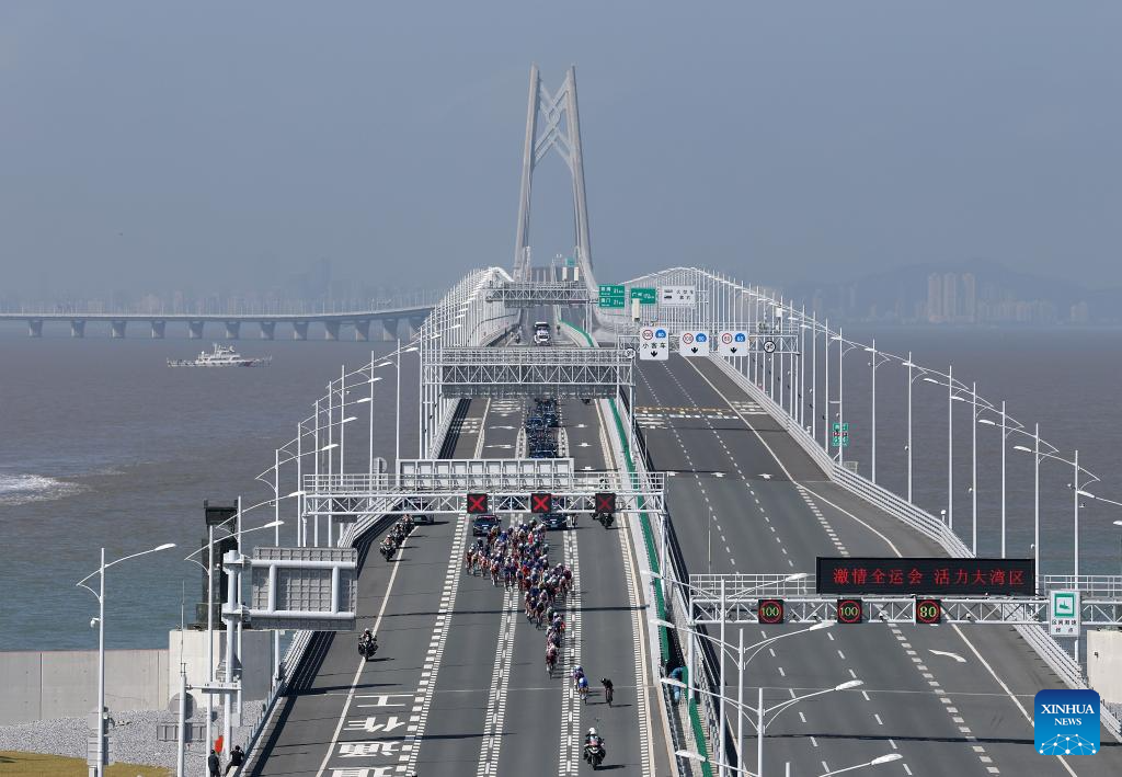 Cyclists compete across the Hong Kong-Zhuhai-Macao Bridge during the men's road race of cycling road at China's 15th National Games in south China's Guangdong Province, Nov. 8, 2025. (Xinhua/Mao Siqian)