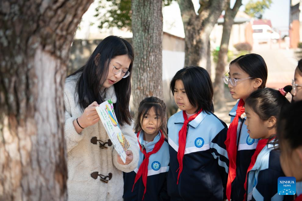 A teacher gives a lesson on bird protection at Maotan Primary School in Guichi District of Chizhou City, east China's Anhui Province, Nov. 18, 2025. (Xinhua/Zhang Duan)