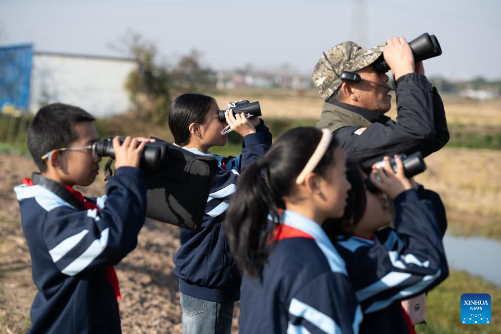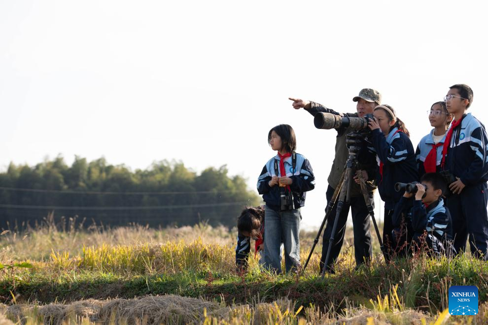 Students of Maotan Primary School observe birds under the guidance of a wild bird conservation volunteer at the Shibasuo provincial nature reserve in Chizhou City, east China's Anhui Province, Nov. 18, 2025. (Xinhua/Zhang Duan)