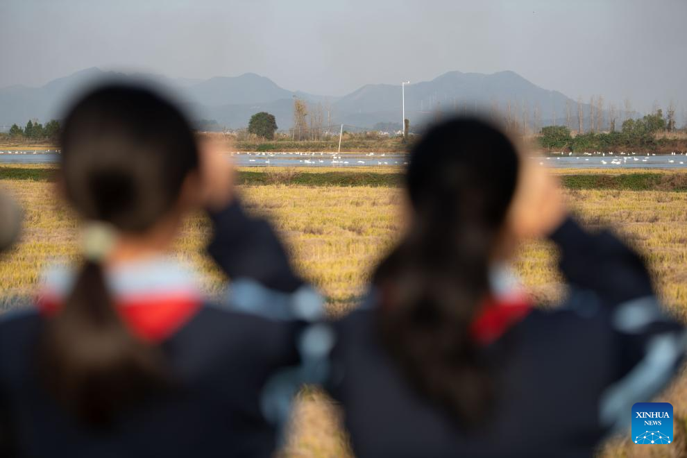 A flock of egrets flies behind as students of Maotan Primary School observe birds under the guidance of a wild bird conservation volunteer at the Shibasuo provincial nature reserve in Chizhou City, east China's Anhui Province, Nov. 18, 2025. (Xinhua/Zhang Duan)
