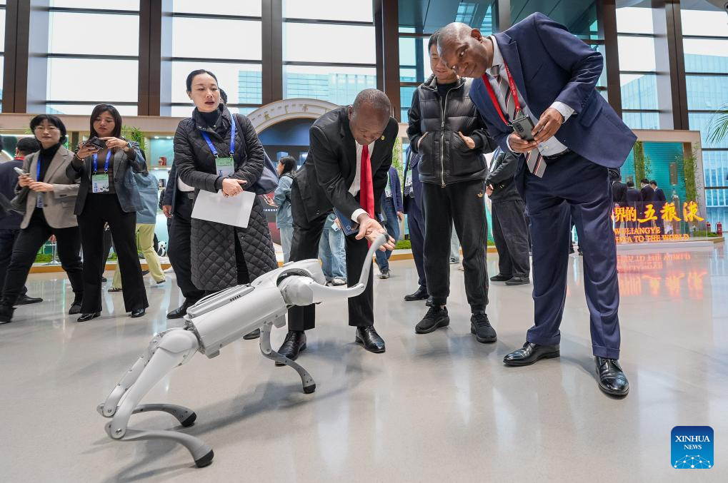 Guests interact with a robot at the Global Panda Partners 2025 conference in Chengdu, southwest China's Sichuan Province, Nov. 21, 2025.