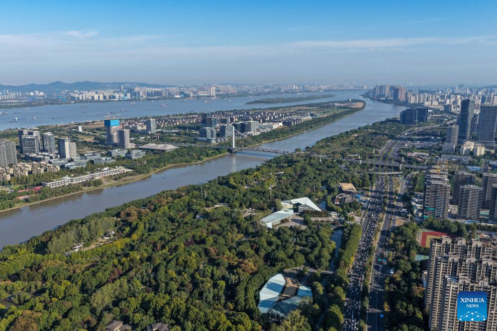 An aerial drone photo shows a panoramic view of vessels sailing along the Yangtze River in Nanjing, east China's Jiangsu Province, Nov. 2, 2023.