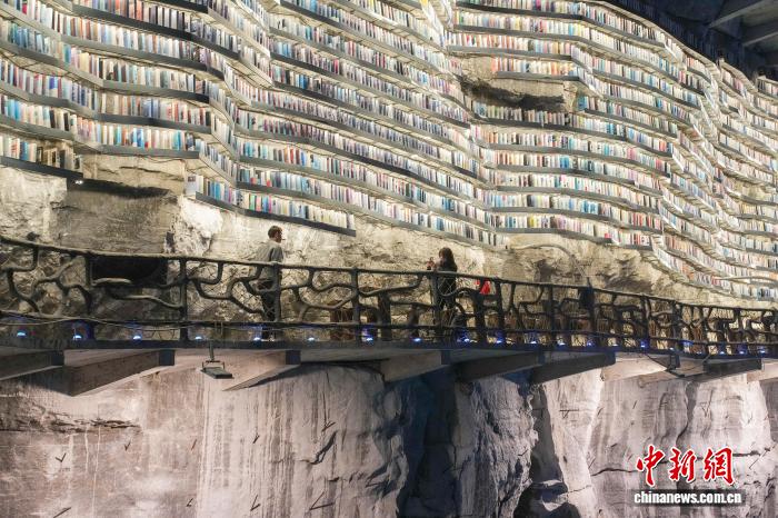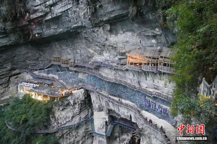 A cliffside bookstore built along the sheer rock wall of a vast karst sinkhole has drawn a steady stream of visitors to a scenic area in Mianhua village, Luocheng Mulao Autonomous County, Hechi city, south China's Guangxi Zhuang Autonomous Region.
