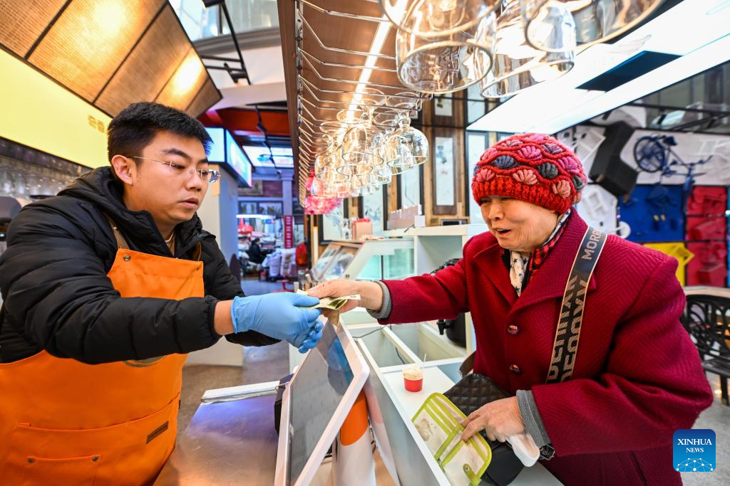 A senior woman pays at an ice-cream stall at Sanshui grocery market in Hexi District of Tianjin, north China, Nov. 25, 2025. (Xinhua/Zhao Zishuo)