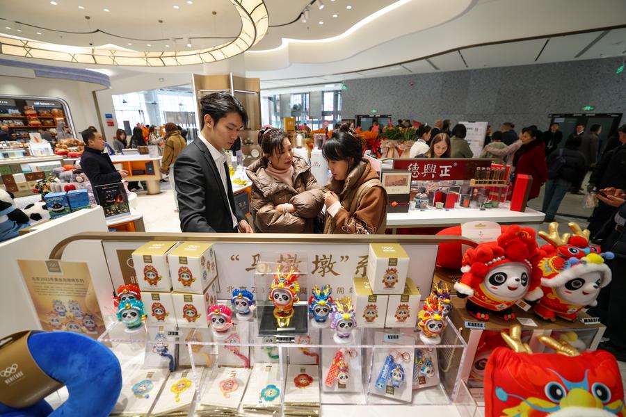 People shop for products themed on Bing Dwen Dwen, the mascot of Beijing 2022 Olympic Winter Games, at a downtown duty-free shop in north China's Tianjin Municipality, Nov. 28, 2025. (Xinhua/Sun Fanyue)