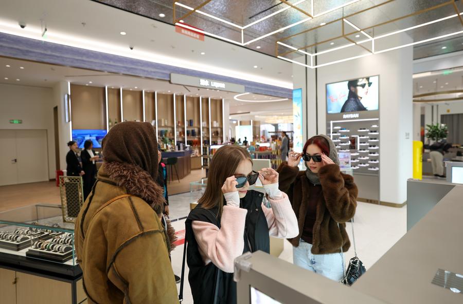 Foreign customers try sunglasses at a downtown duty-free shop in north China's Tianjin Municipality, Nov. 28, 2025. (Xinhua/Sun Fanyue)