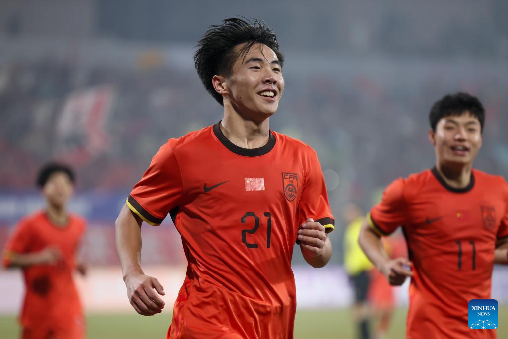 Shuai Weihao (C) of China celebrates his goal during the AFC U17 Asian Cup 2026 Qualifier group A match between China and Bangladesh in southwest China's Chongqing Municipality, Nov. 30, 2025. (Xinhua/Huang Wei)