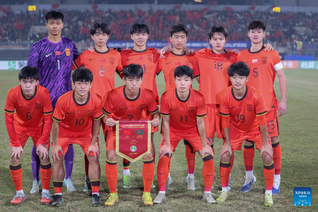 Starters of China pose before during the AFC U17 Asian Cup 2026 Qualifier group A match between China and Bangladesh in southwest China's Chongqing Municipality, Nov. 30, 2025. (Xinhua/Huang Wei)