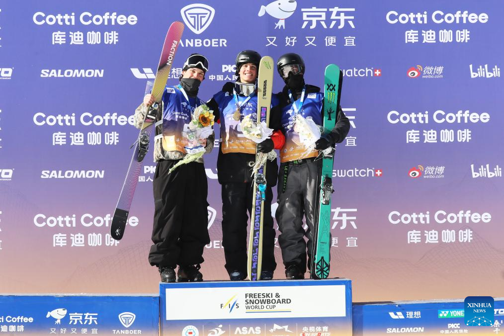 Gold medalist Troy Podmilsak (C) of the United States, silver medalist Dylan Deschamps (L) of Canada and bronze medalist Luca Harrington of New Zealand pose for photos during the awarding ceremony for the men's final of the FIS Freeski Big Air World Cup 2026 at Secret Garden in Zhangjiakou, north China's Hebei Province, Nov. 29, 2025. (Photo by Wu Diansen/Xinhua)