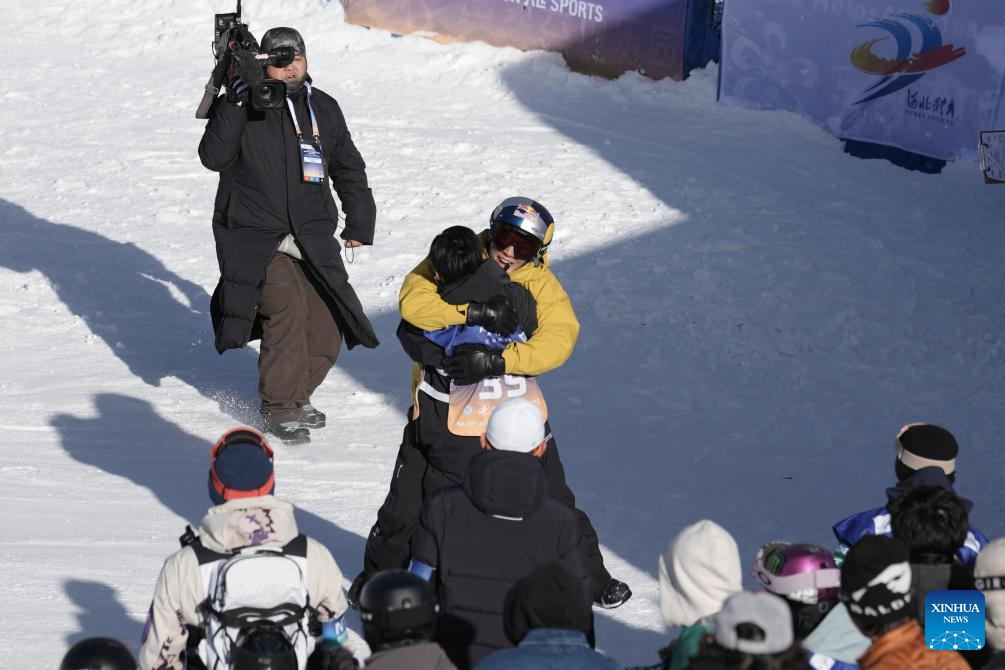 Gold medalist Su Yiming (center R) of China and silver medalist Ge Chunyu of China hug each other after the men's final of the FIS Snowboard Big Air World Cup 2026 at Secret Garden in Zhangjiakou, north China's Hebei Province, Nov. 29, 2025. (Xinhua/Lu Xingji)