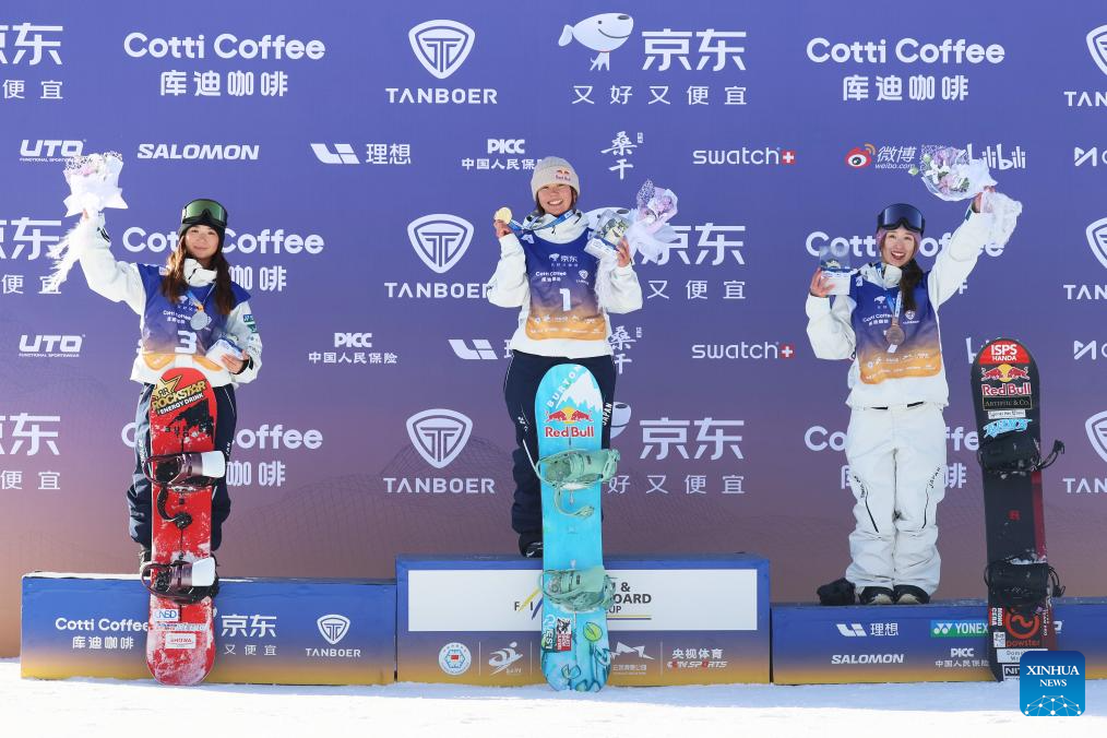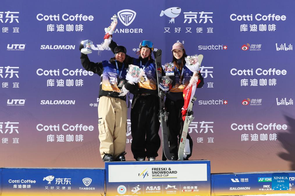 Gold medalist Kirsty Muir (C) of Britain, silver medalist Naomi Urness (L) of Canada and bronze medalist Liu Mengting of China pose for photos during the awarding ceremony for the women's final of the FIS Freeski Big Air World Cup 2026 at Secret Garden in Zhangjiakou, north China's Hebei Province, Nov. 29, 2025. (Photo by Wu Diansen/Xinhua)
