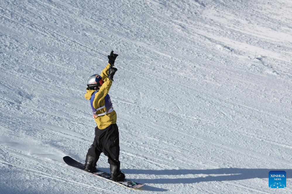 Su Yiming of China celebrates during the men's final of the FIS Snowboard Big Air World Cup 2026 at Secret Garden in Zhangjiakou, north China's Hebei Province, Nov. 29, 2025. (Xinhua/Lu Xingji)