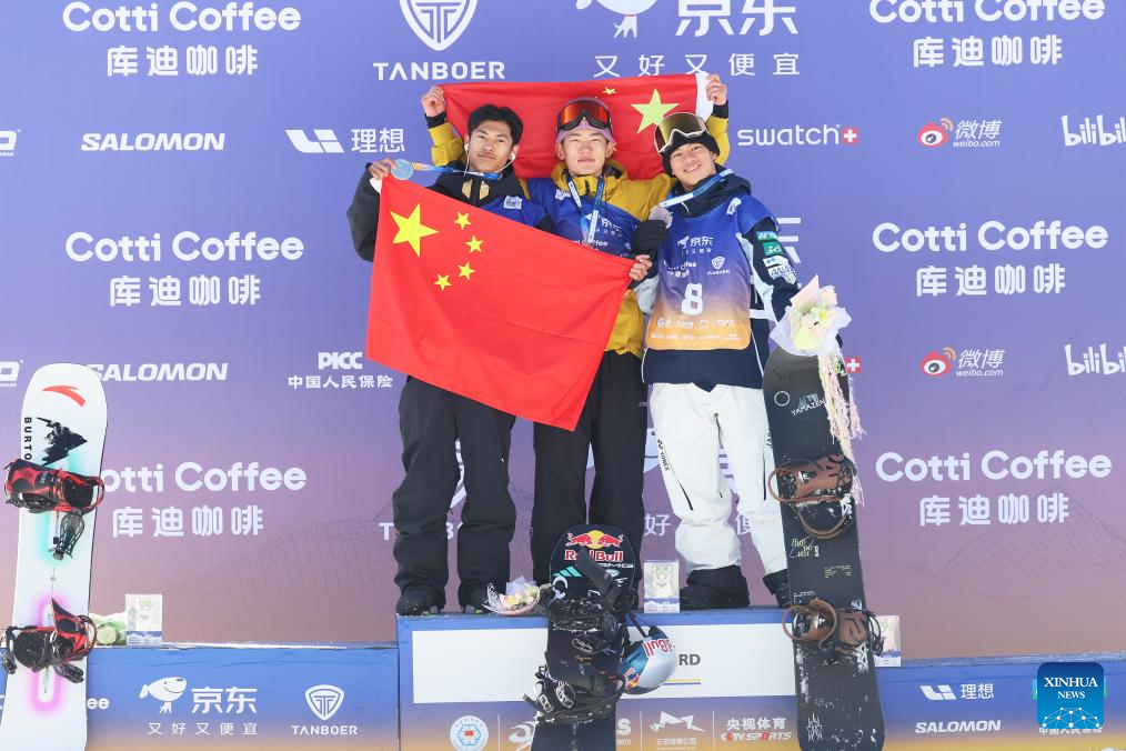 Gold medalist Su Yiming (C) of China, silver medalist Ge Chunyu (L) of China and bronze medalist Kimata Ryoma of Japan pose for photos during the awarding ceremony for the men's final of the FIS Snowboard Big Air World Cup 2026 at Secret Garden in Zhangjiakou, north China's Hebei Province, Nov. 29, 2025. (Photo by Wu Diansen/Xinhua)