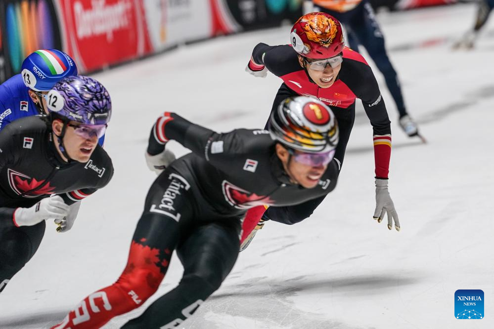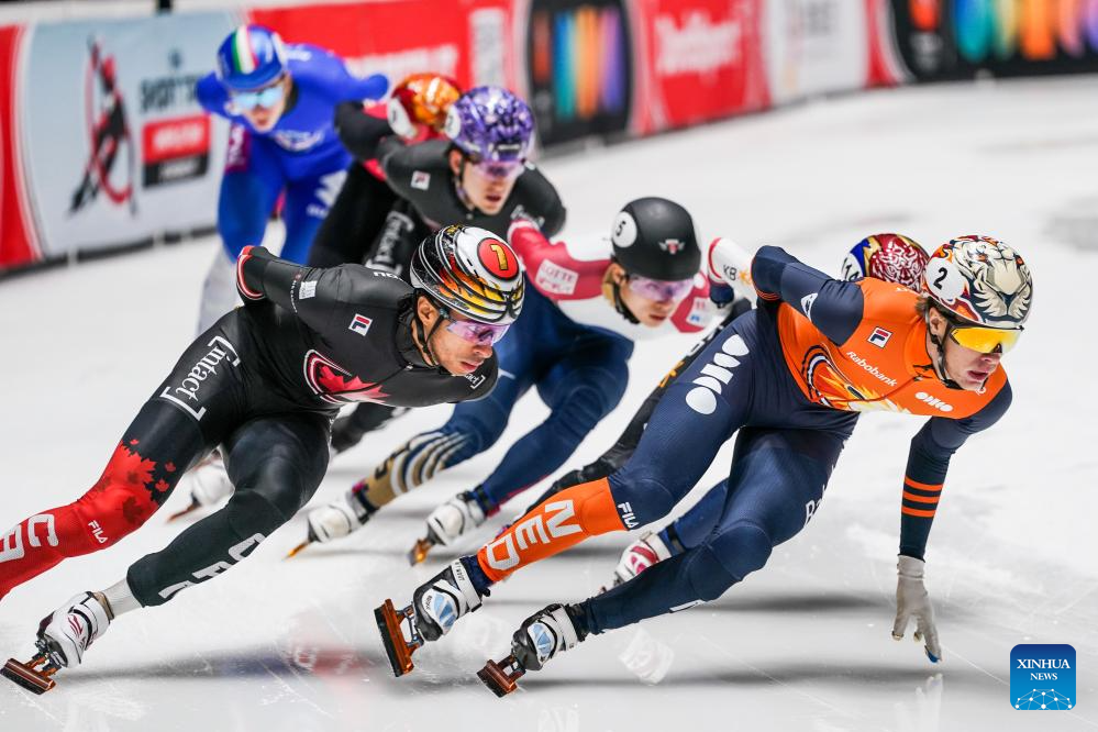 William Dandjinou (front L) of Canada competes during the men's 1500m final at the ISU Short Track World Tour #4 speed skating event in Dordrecht, the Netherlands, Nov. 29, 2025. (Xinhua/Peng Ziyang)