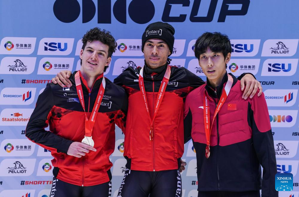 Gold medalist William Dandjinou (C) of Canada, silver medalist Felix Roussel (L) of Canada and bronze medalist Sun Long of China pose for photos during the awarding ceremony for the men's 1500m final at the ISU Short Track World Tour #4 speed skating event in Dordrecht, the Netherlands, Nov. 29, 2025. (Xinhua/Peng Ziyang)